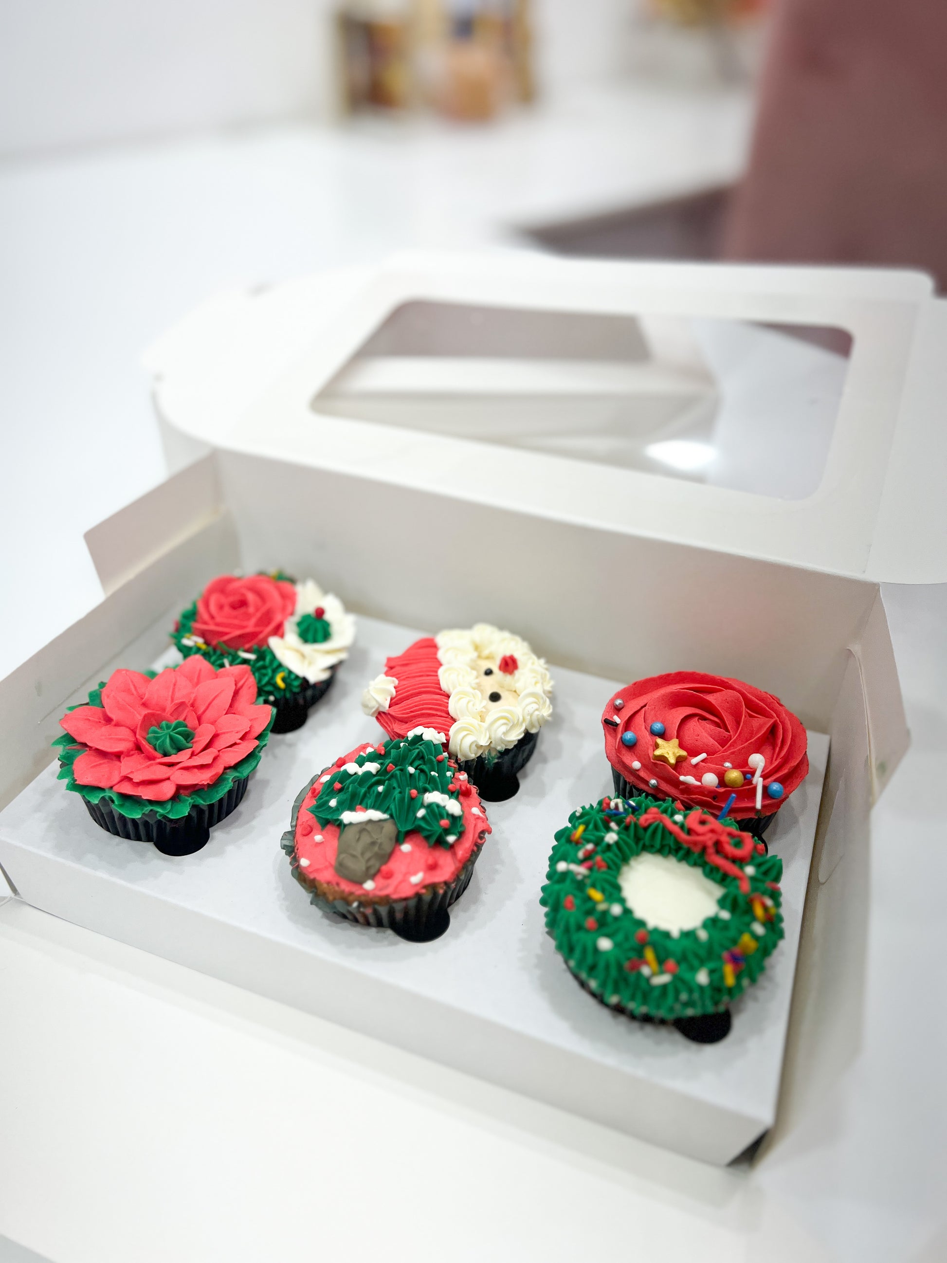 box of 6 handcrafted cupcakes adorned with stunning Christmas-