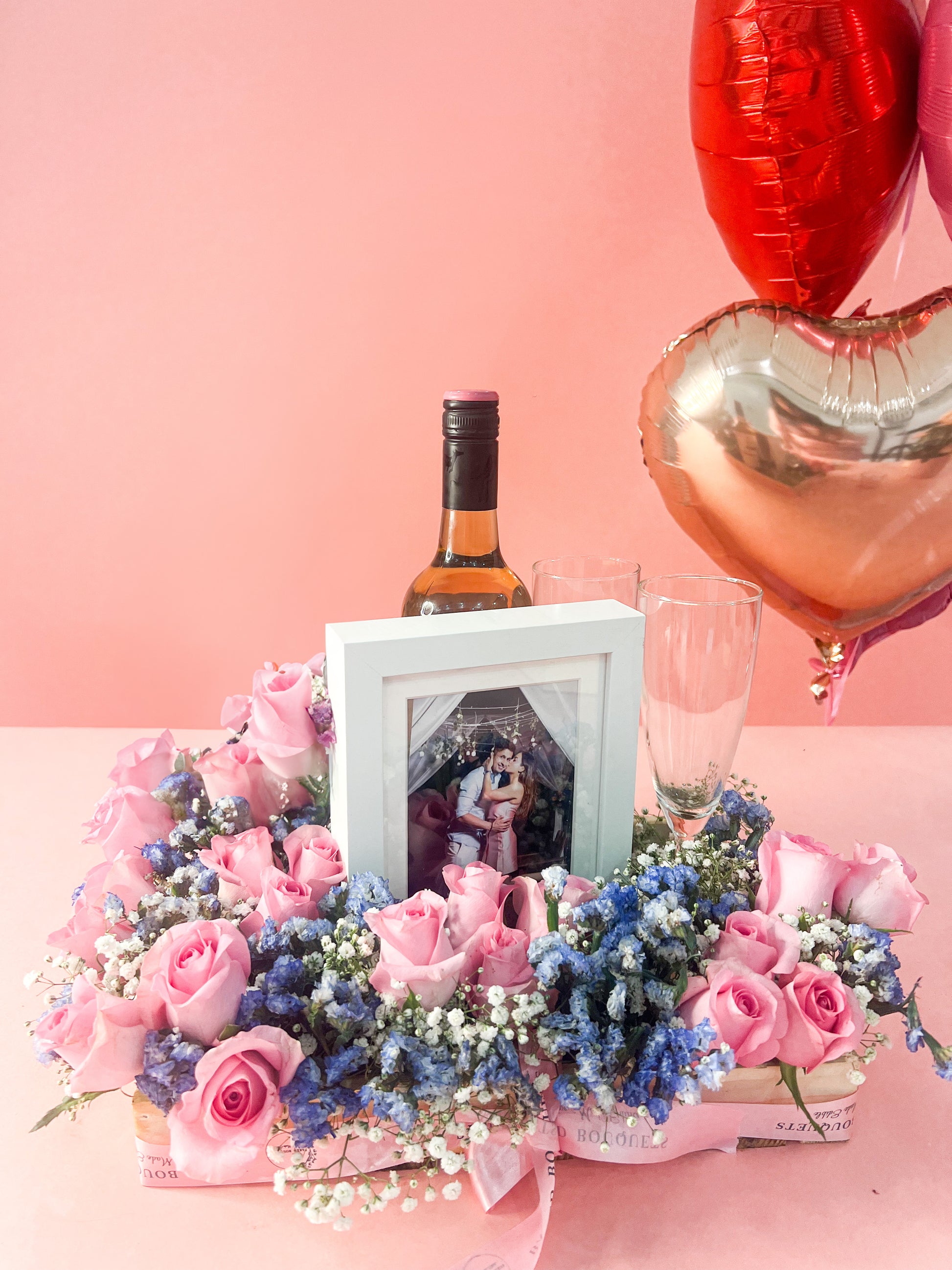 Toast to love with The Perfect Two, a thoughtful duo featuring wine, a set of elegant wine glasses and a romantic photo frame with fresh flowers